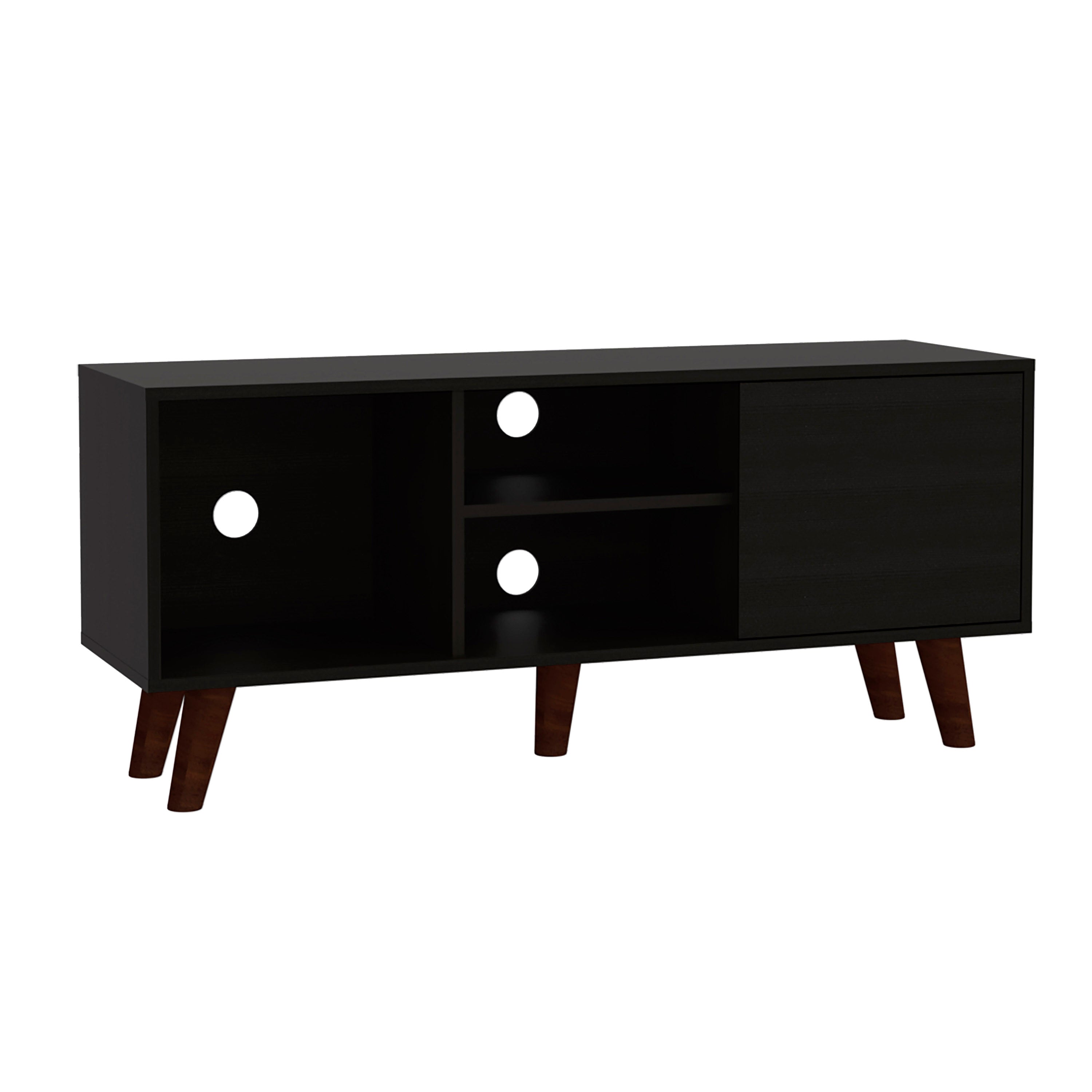 This ingeniously designed Ontario Tv stand accommodates your TV. It provides extra storage, with a large top surface for your TV (45,2"W X 13,7"D) with a capacity of 50", plus it includes multiple shelves and a single door cabinet (14,1"W X 12,5"H) with internal storage. The back holes are ideal for keeping your cables tidied away.