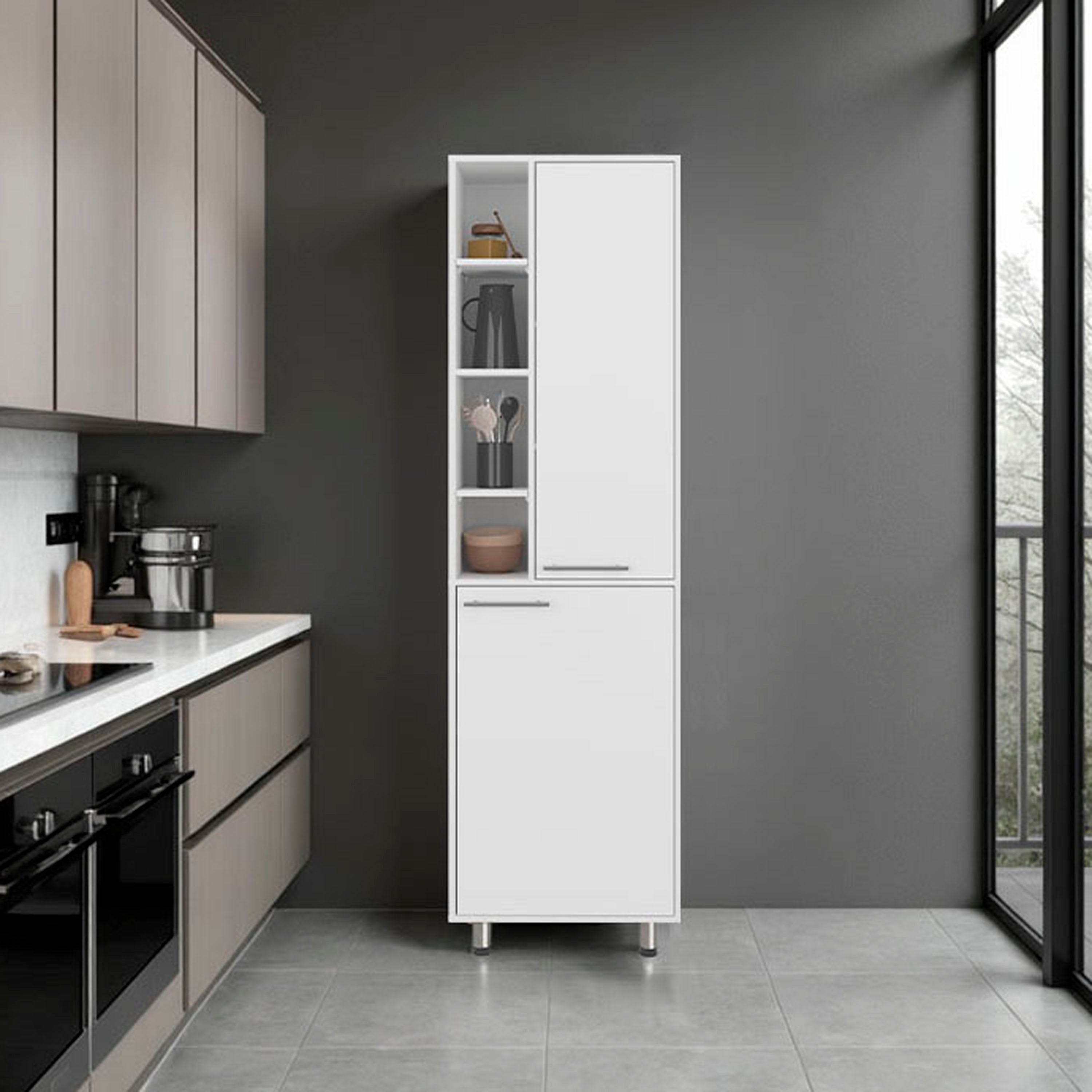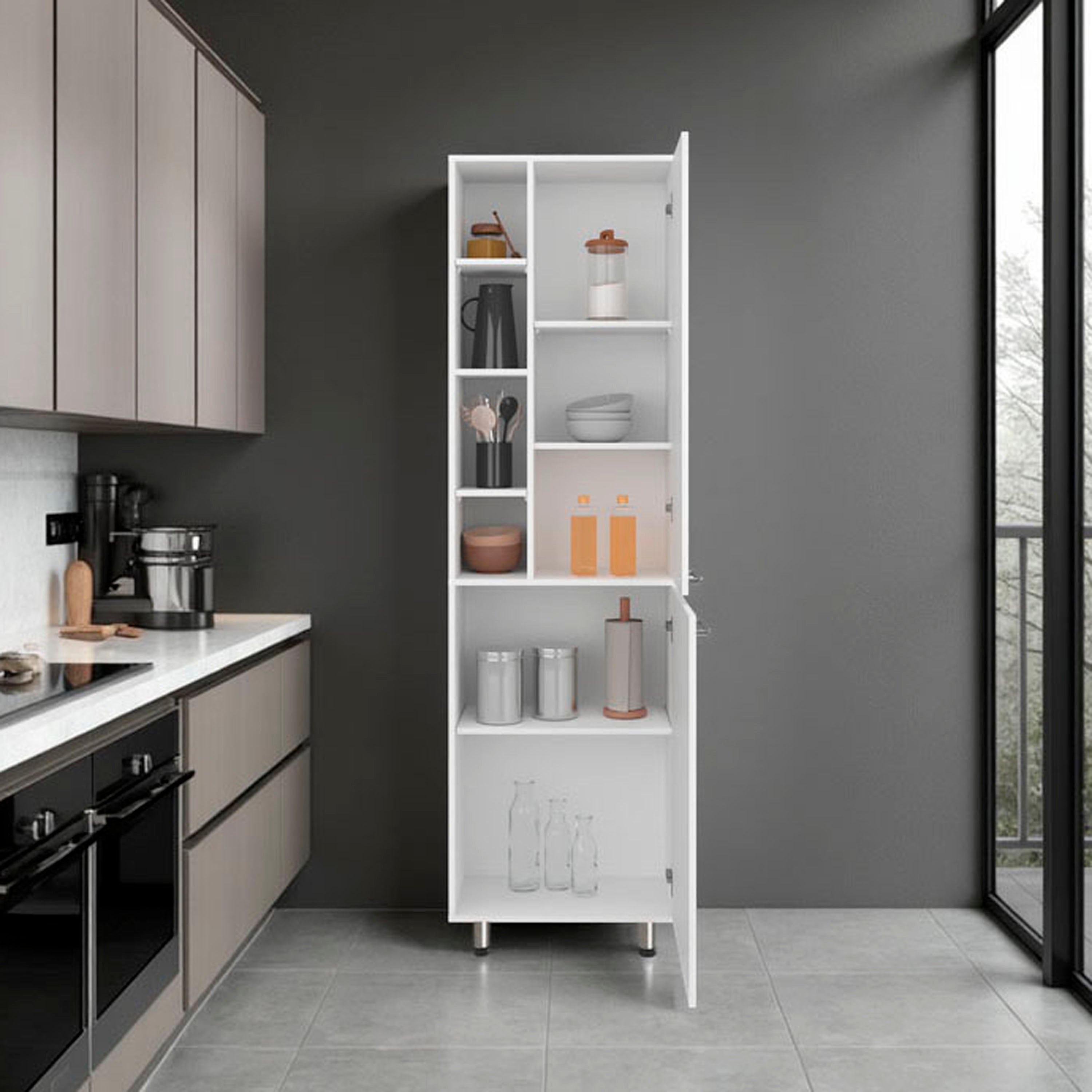 Enetai Kitchen Pantry, 2 Doors, 9 Shelves, 4 Legs