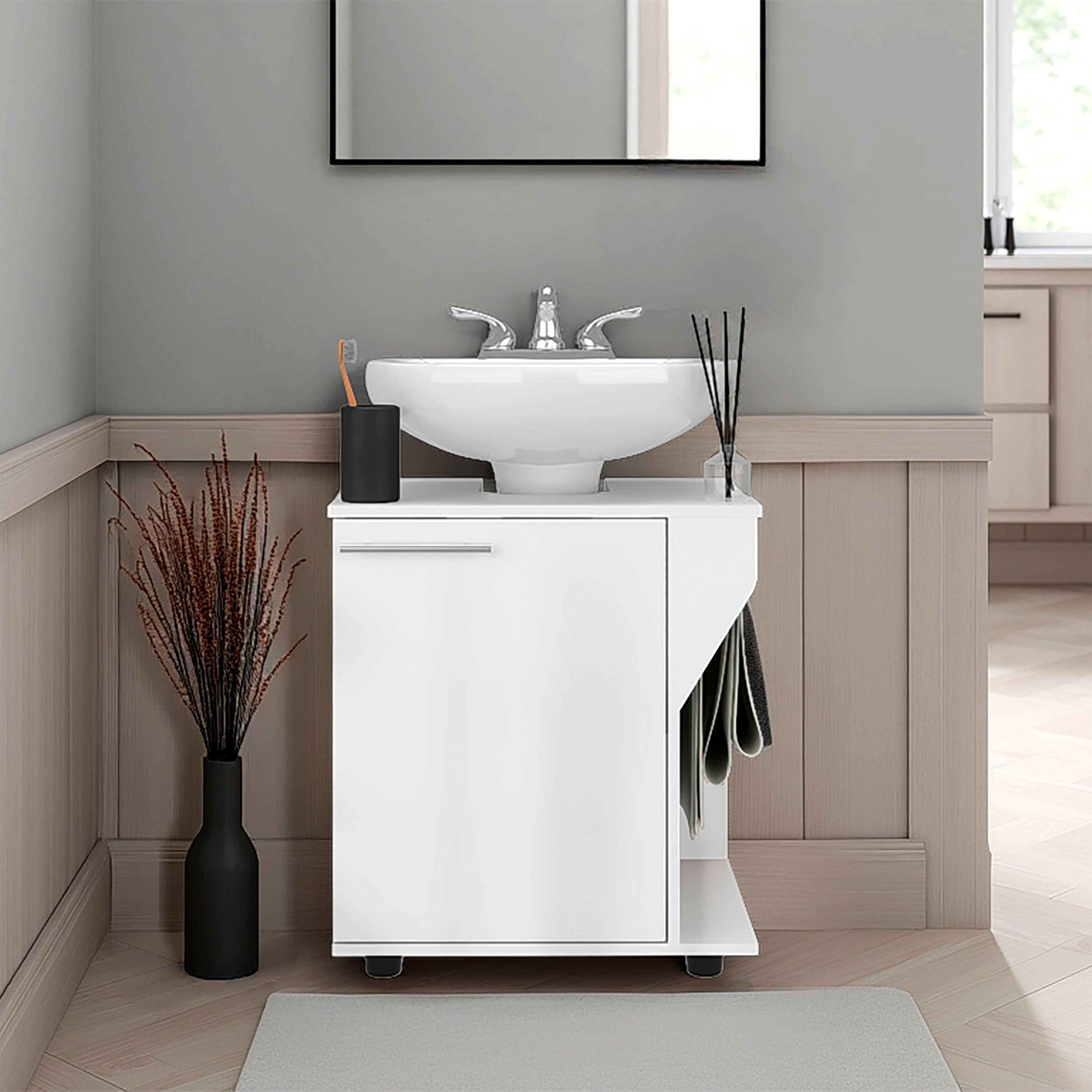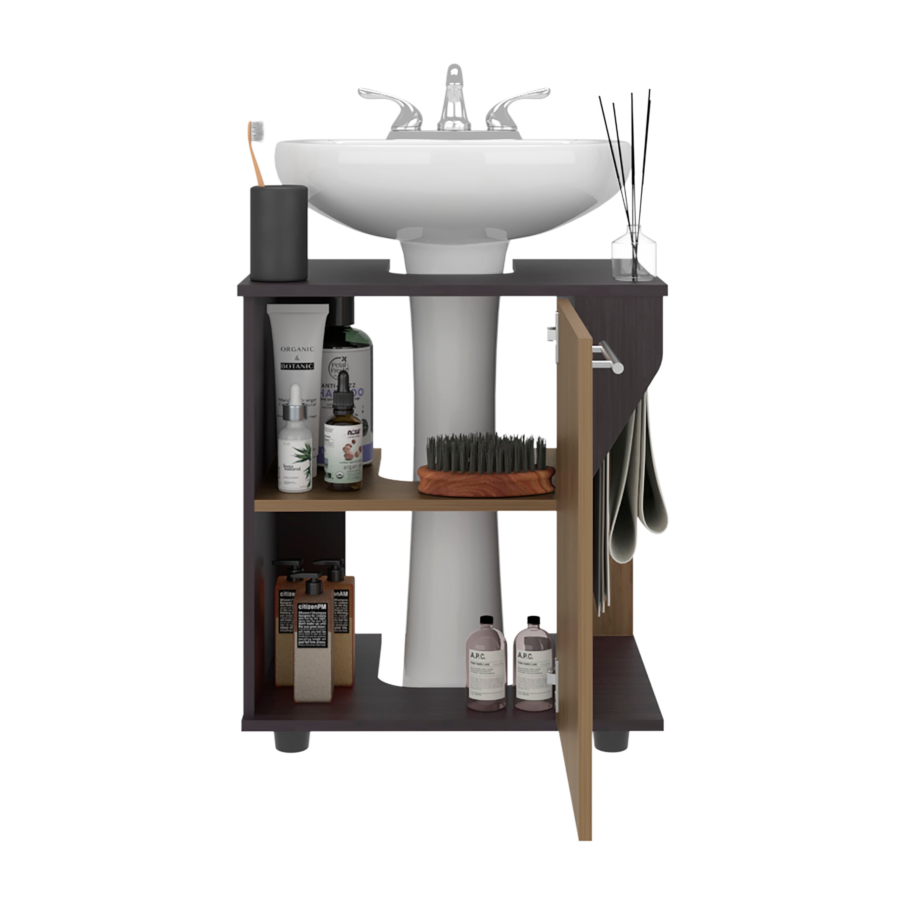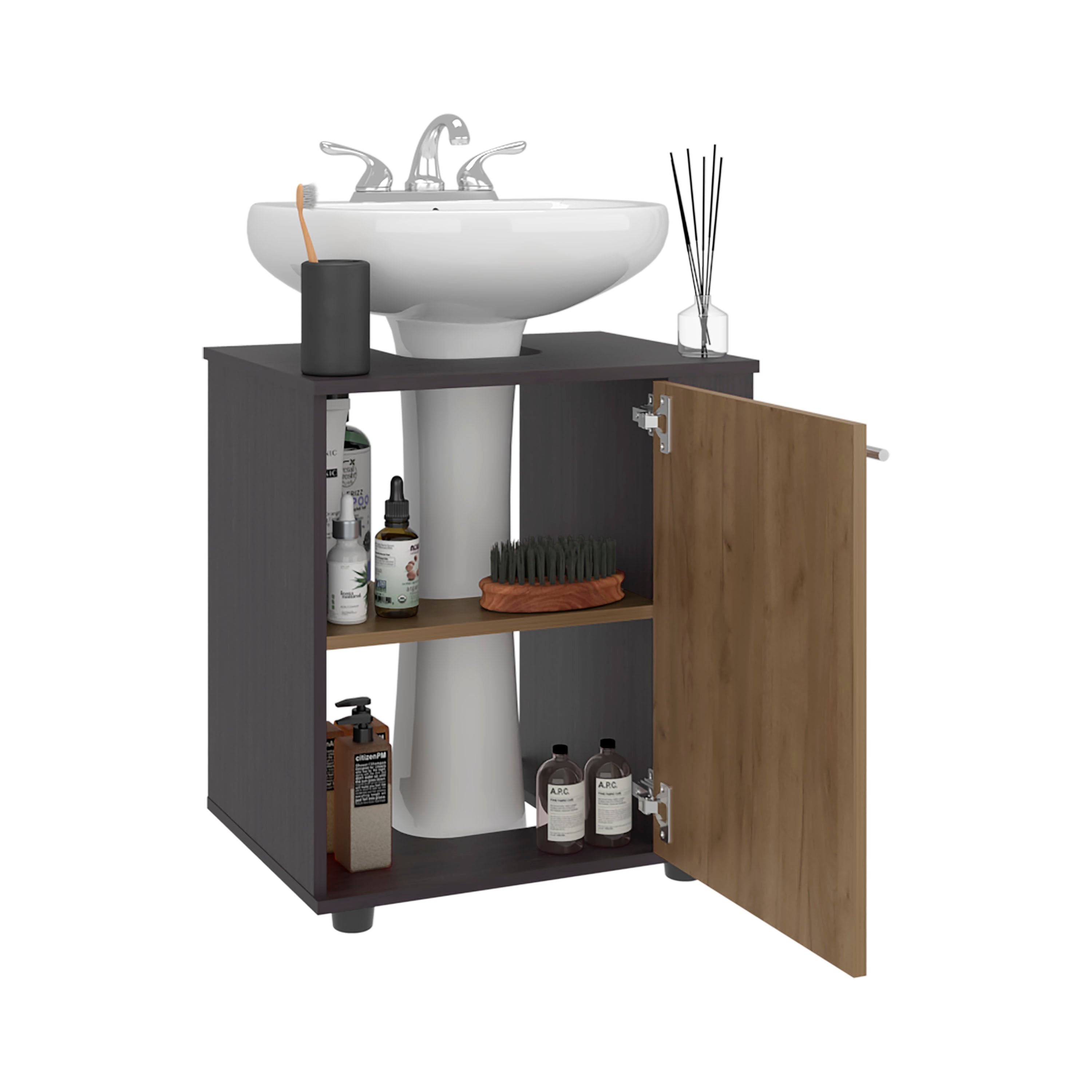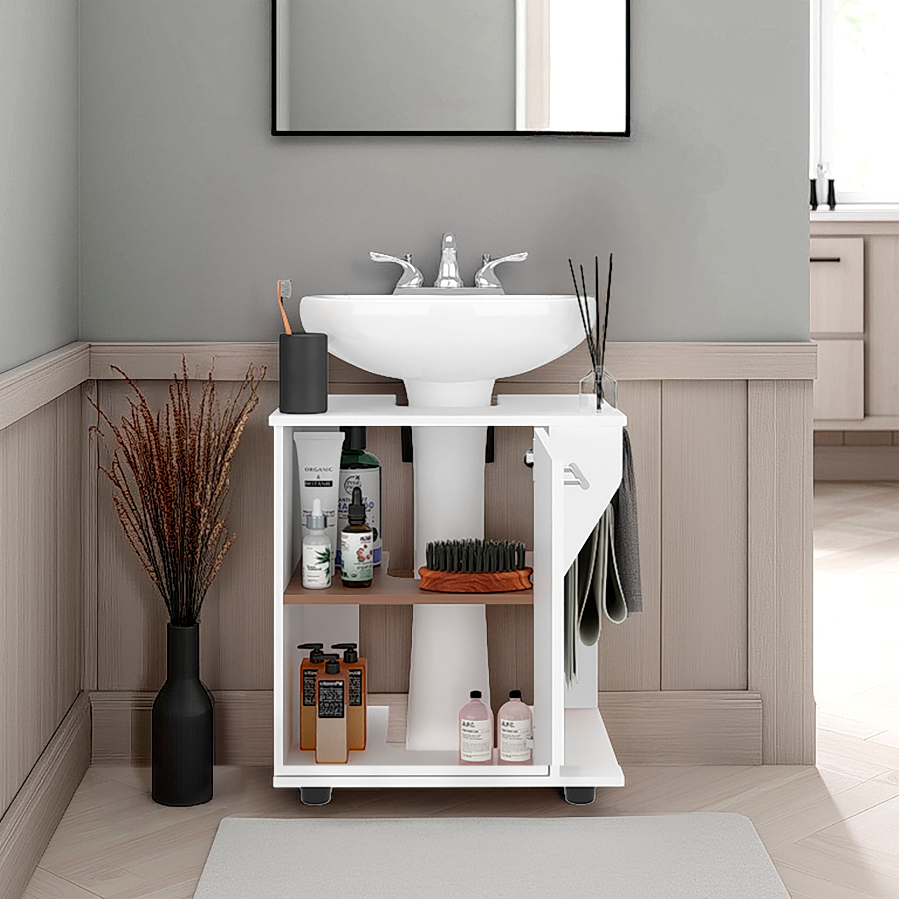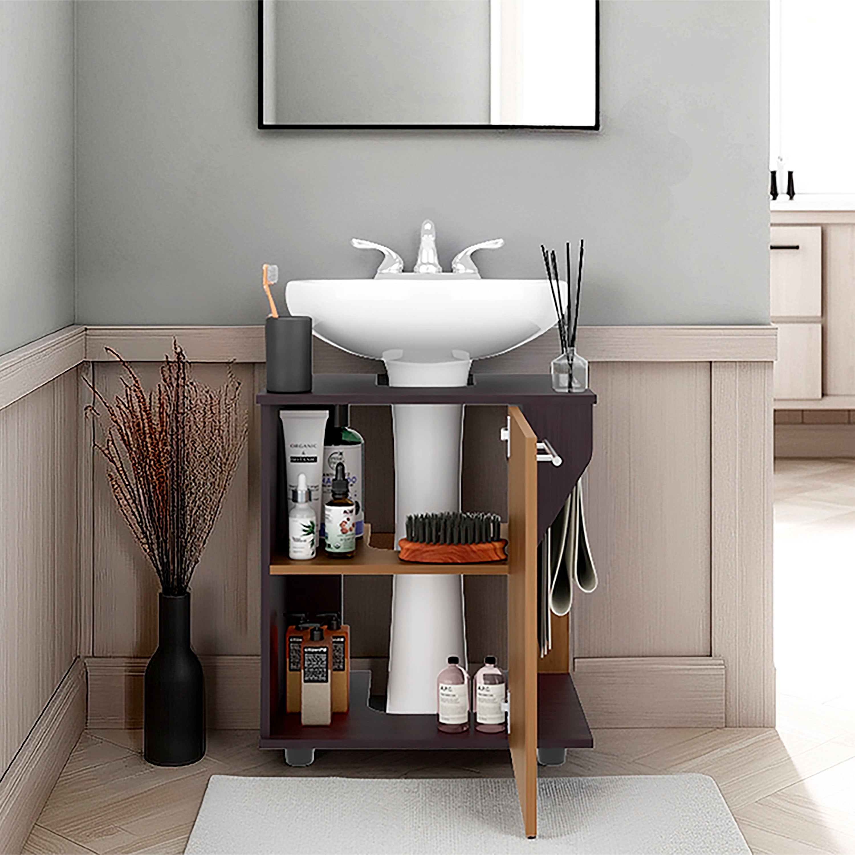 The Enfield Under Sink Storage combines functionality with style, offering practical storage for your bathroom essentials. Featuring one door, two shelves, and a four-leg base, it provides ample space for organizing toiletries, towels, and cleaning products. It seamlessly blends with any bathroom decor, adding a modern and sophisticated touch to your space.