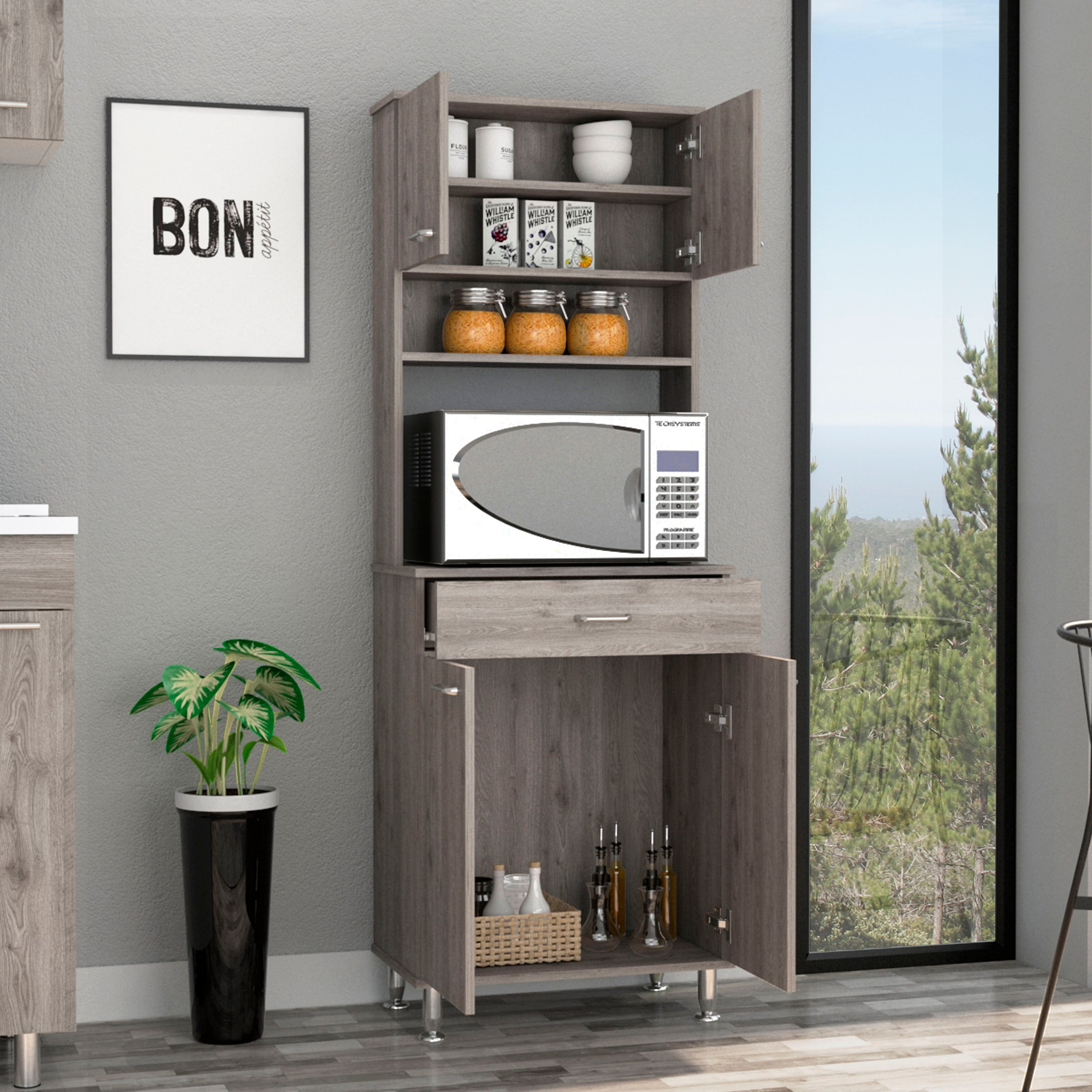 The Helis 60 Pantry Double Door Cabinet is a kitchen organization station that frees up valuable counter and cabinet space, holding your microwave, coffee maker, and other small appliances. It features a bottom cabinet for bigger items such as pots and pans, a top spice rack and cabinet, and a spacious top surface to place a big microwave or prep meals, top. Designed with elegant Black Wengue, Light Grey, White, Light Oak, Smokey Oak manufactured Wood finish.