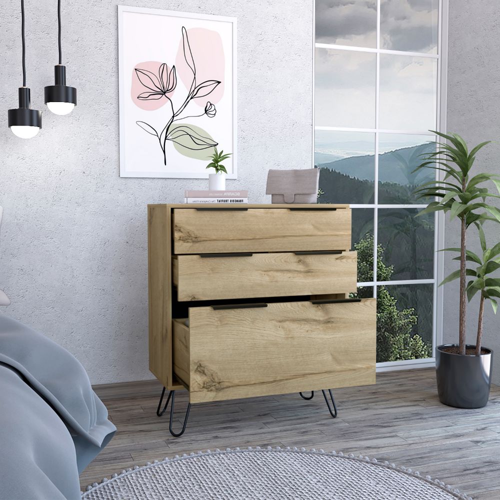 Saffron dresser is sure to spice up your bedroom! It has three large storage drawers (4,3’’H X 26,7’’W X 8,2’’H X 26,7’’W) to help you organize your clothes and accessories. And the hairpin legs give it a warm/modern touch. So why not add a touch of color to your room with this stylish dresser? Complement your bedroom collection with the Saffron dresser! Designed with elegant light oak manufactured wood finish.
